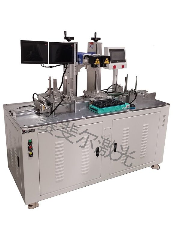 本系統設計為全自動工作方式,雙激光頭配置,由自動上料工位、傳輸線、激光打標工位、自動下料工位組成。